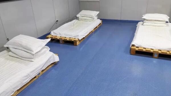 由于新冠病毒傳染性強、潛伏期長等特性,配送人員多次往返醫(yī)院等高危場所,接觸人員復雜,極易暴露,為節(jié)約時間,同時消除疫情擴散的潛在隱患,值班人員把公司培訓室改成臨時臥室,兩張木質托盤一拼就成了他們的床,當我們還沉睡在被窩里時,他們已經在送貨的路上。