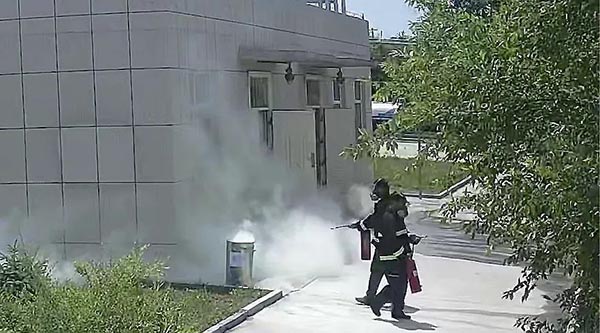 演練模擬了乙醇罐區(qū)在槽車卸醇時發(fā)生泄漏引發(fā)火災(zāi)事故,現(xiàn)場員工第一時間開展應(yīng)急響應(yīng)和初期處置,車間主任接報后立即報告公司應(yīng)急救援指揮部總指揮??傊笓]按照既定方案,疏散現(xiàn)場無關(guān)人員,使用室外消防水冷卻泵房,沙土圍截泄漏物,泡沫滅火裝置和滅火器滅火,組織公司應(yīng)急救援隊伍開展處置,最終將火撲滅。
